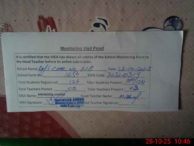 | EMIS Code: 32320319 | Name of School: GPS CHAK NO. 618 TDA | |||