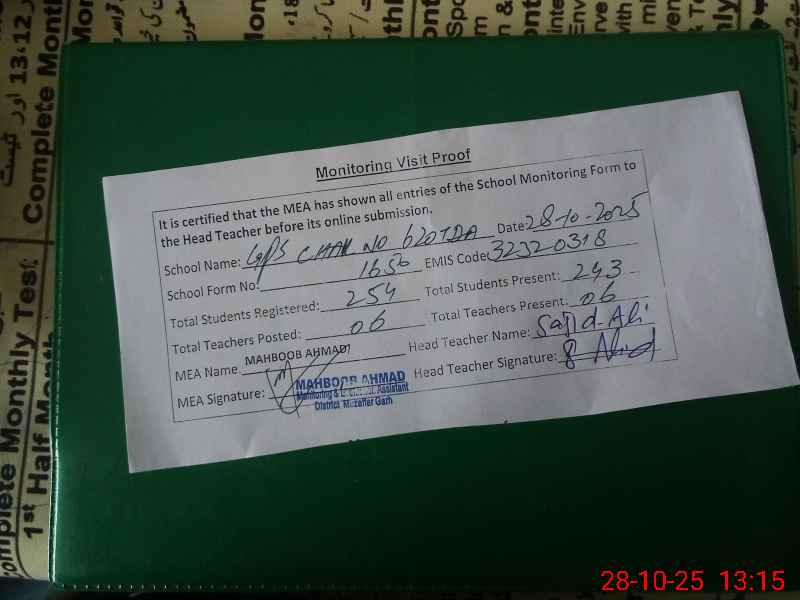 | EMIS Code: 32320318 | Name of School: GPS CHAK NO. 620/TDA | |||
