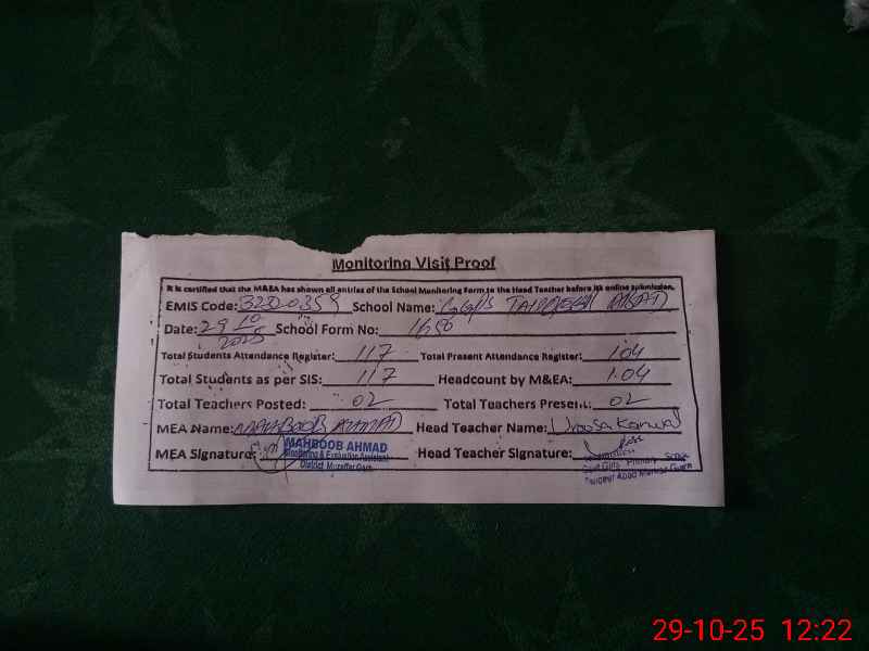 | Attendance Register | Head Teacher | MEA with School | Visit Proof |