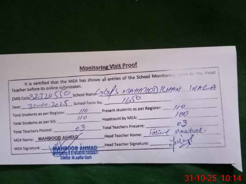 | EMIS Code: 32320550 | Name of School: GGPS MAHMOOD KHAN WALA | |||