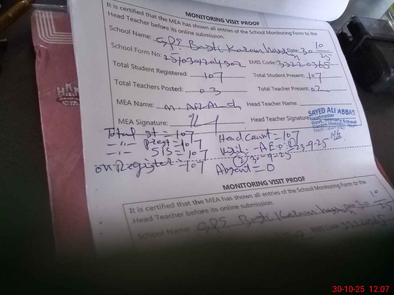 | Attendance Register | Head Teacher | MEA with School | Visit Proof |