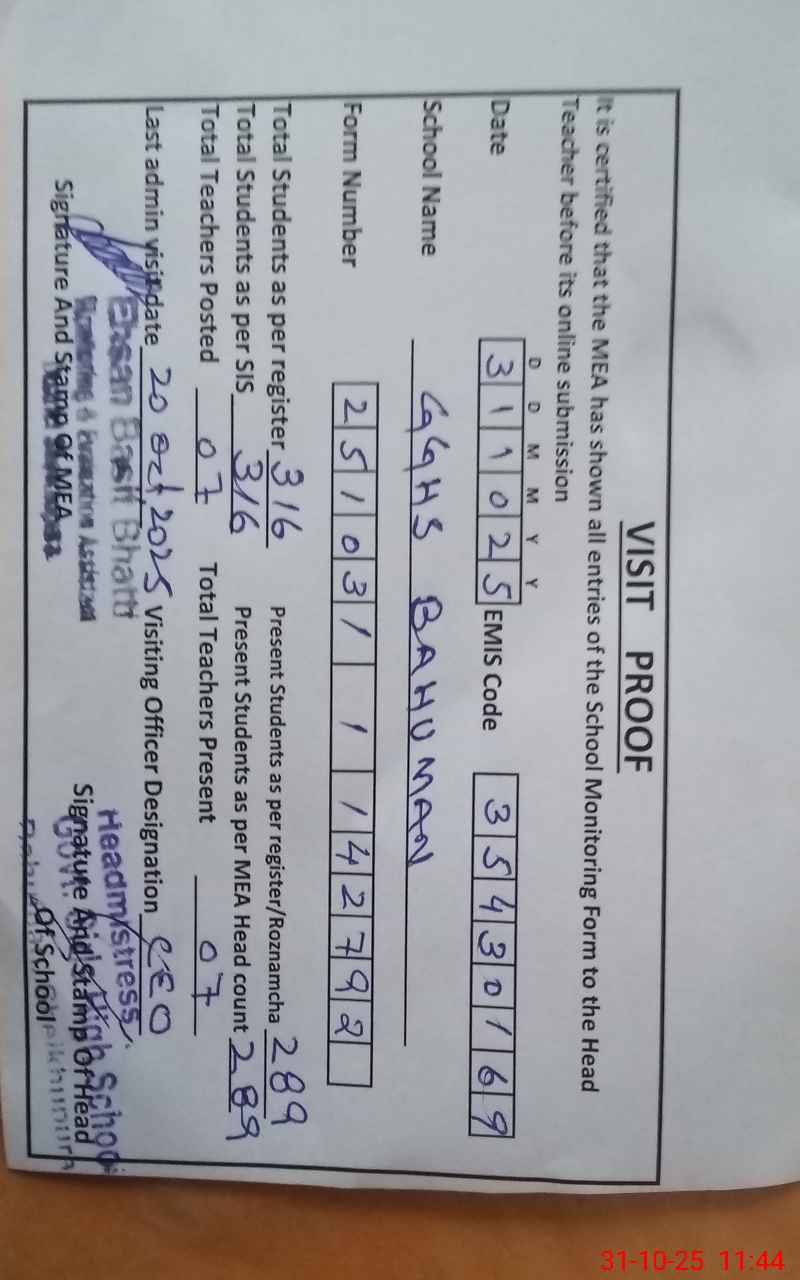 | EMIS Code: 35430169 | Name of School: GGHS BAHUMAN | |||