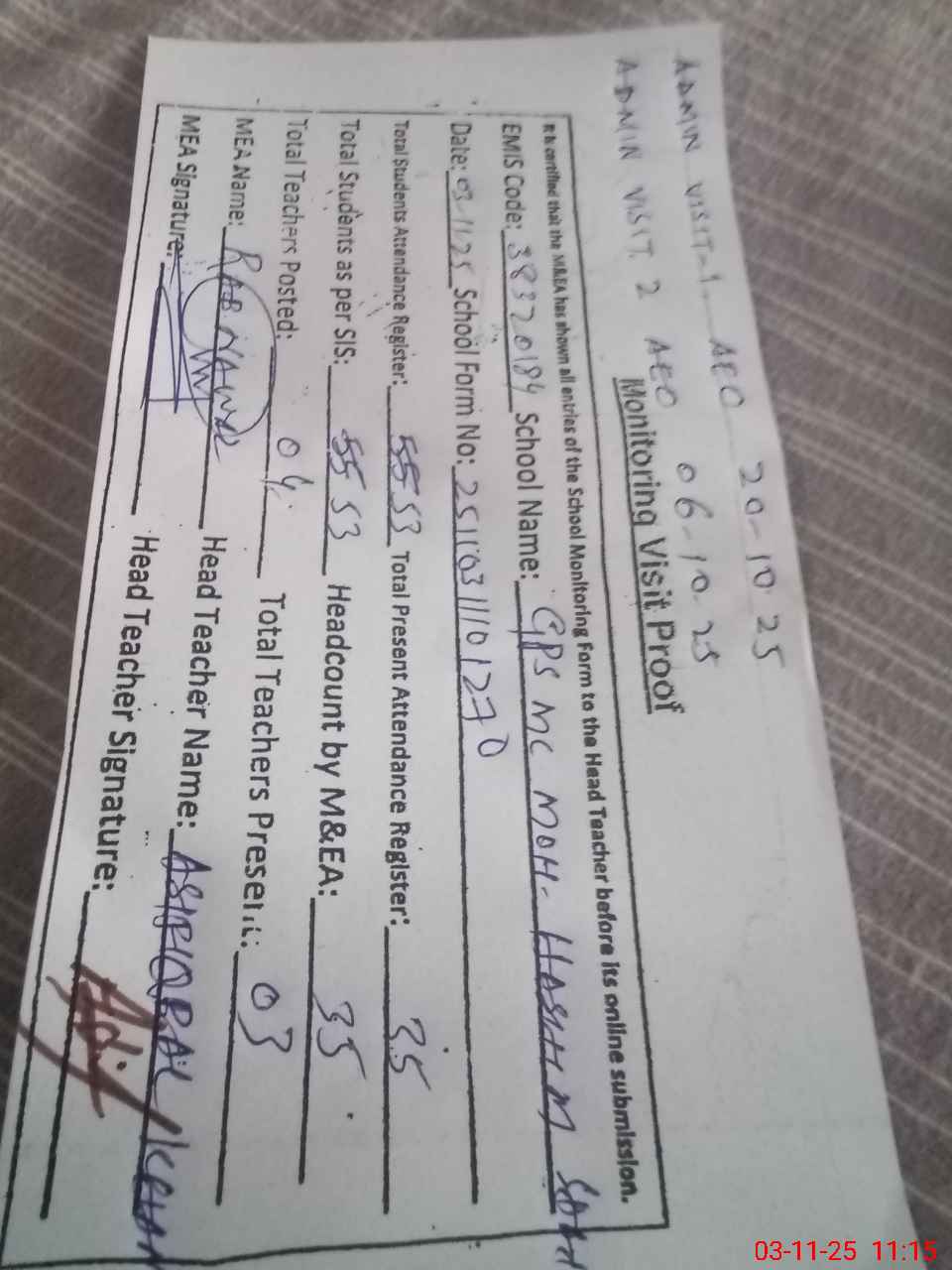 | Attendance Register | Head Teacher | MEA with School | Visit Proof |