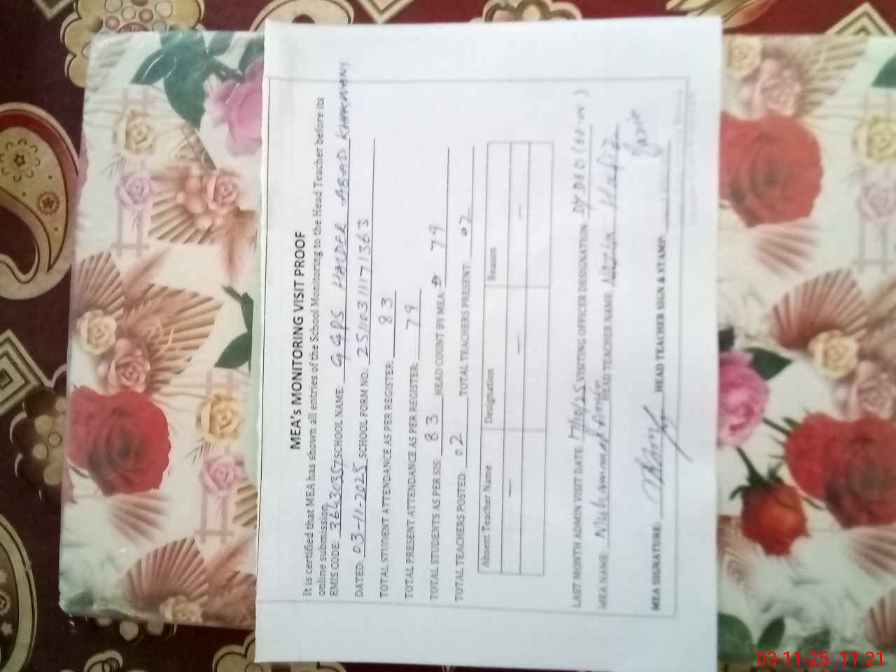 | Attendance Register | Head Teacher | MEA with School | Visit Proof |