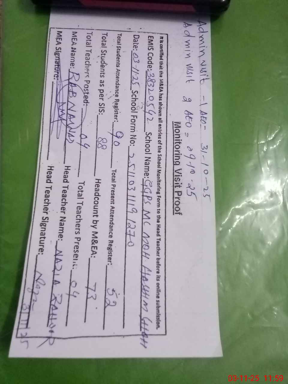 | Attendance Register | Head Teacher | MEA with School | Visit Proof |
