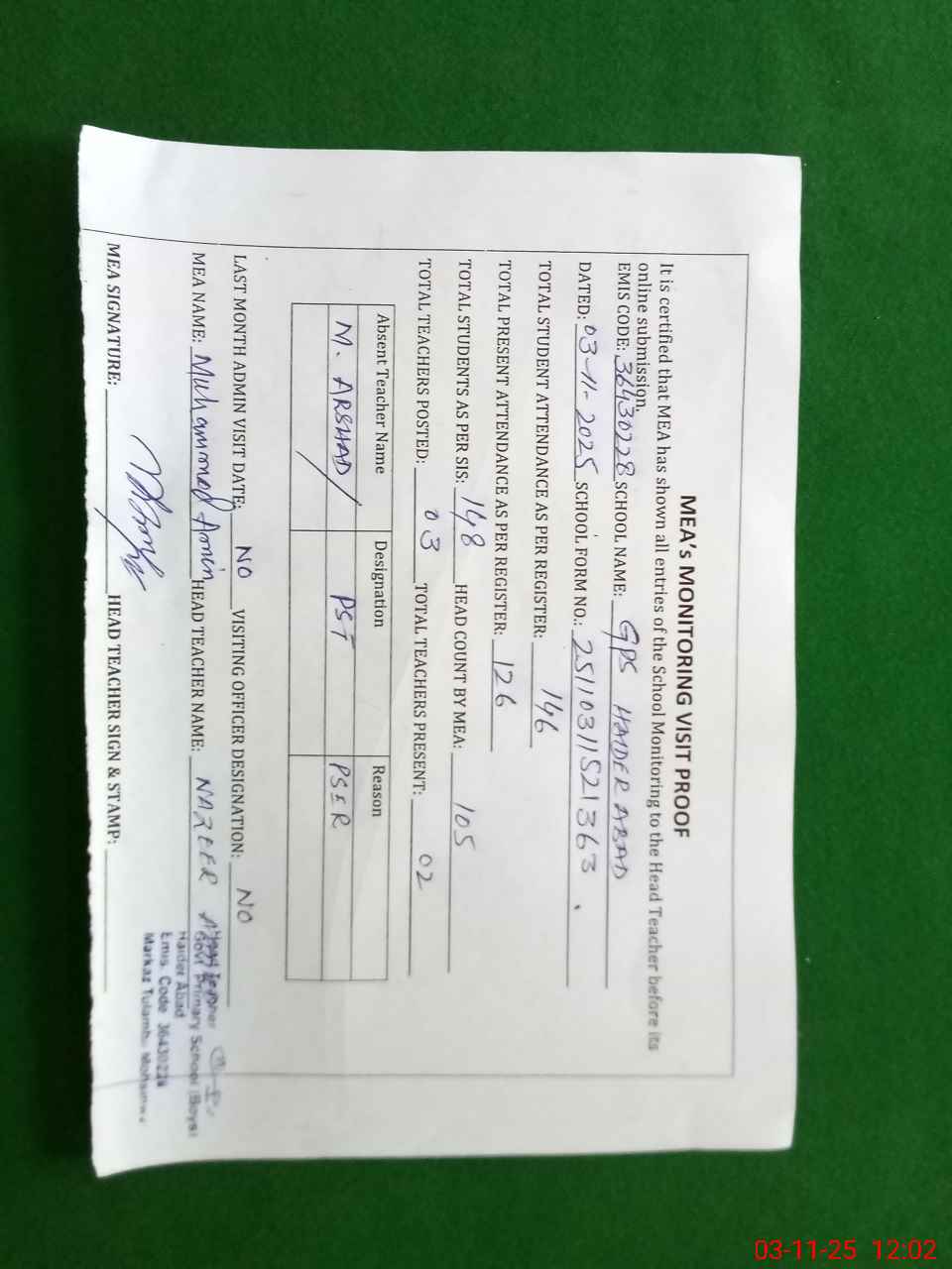 | EMIS Code: 36430228 | Name of School: GPS HAIDER ABAD, TULAMBA | |||