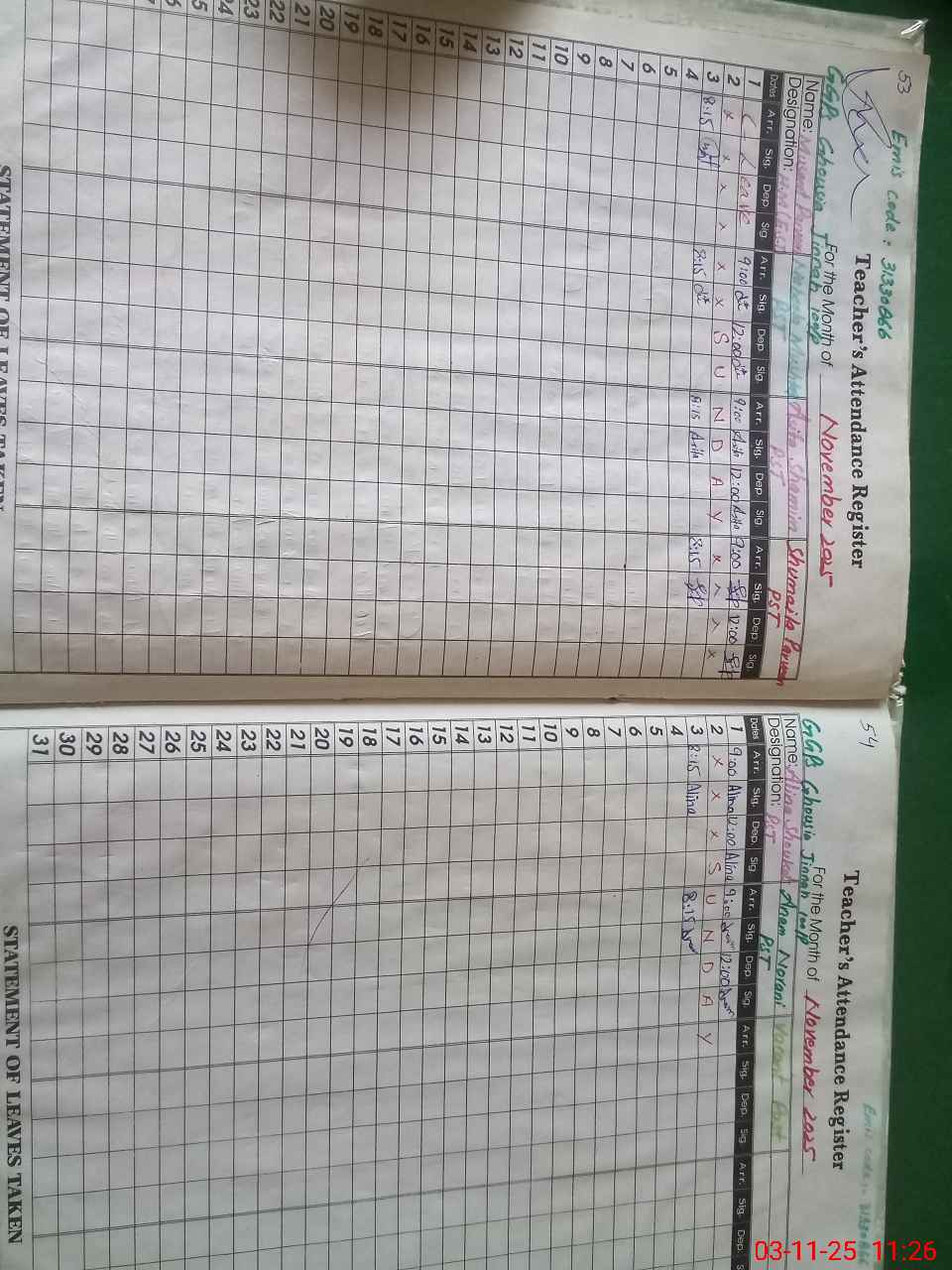 | Total no. of Classrooms: 3 No. of Classrooms Used for Teaching: 2 No. of Classrooms Storing Old Furniture, FTBs, etc: 0Comments if Any: Sir teachers and students attendance on sis not carried out |