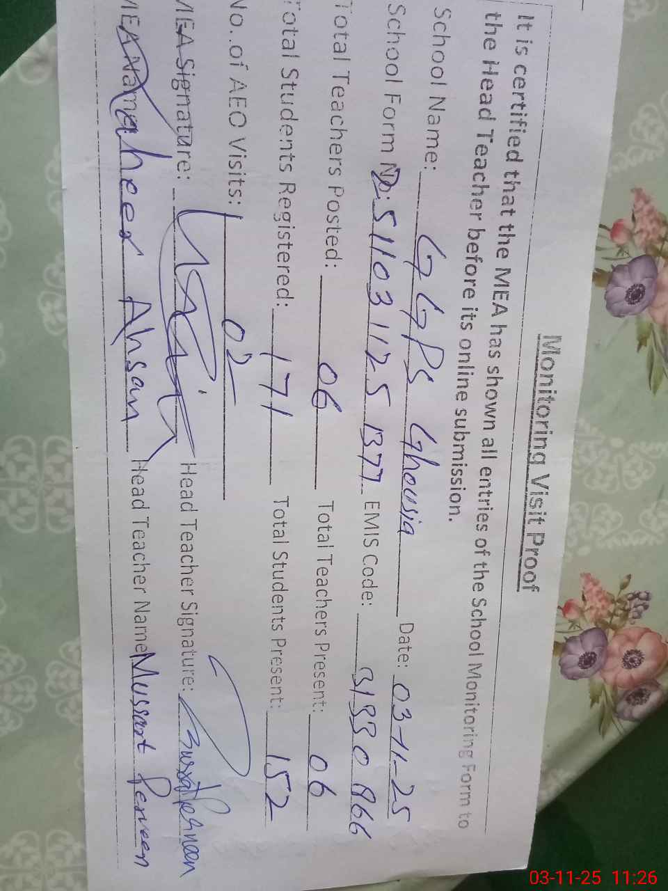 | Certified that this School was Inspected by the Undersigned MEA/DMO Today and the Information Stated Above is as Per Record. | |||||