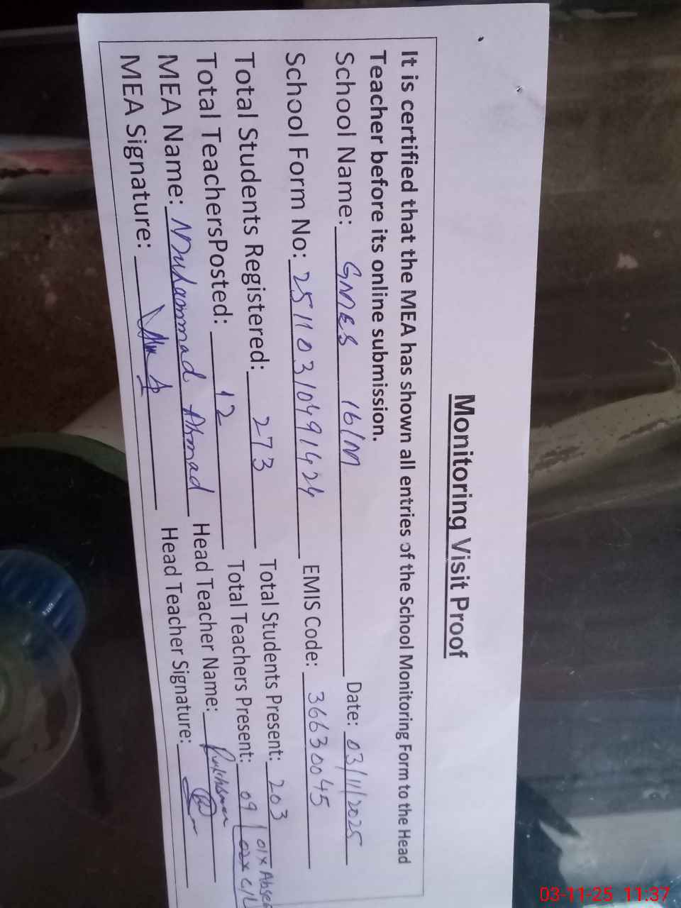 | Attendance Register | Head Teacher | MEA with School | Visit Proof |