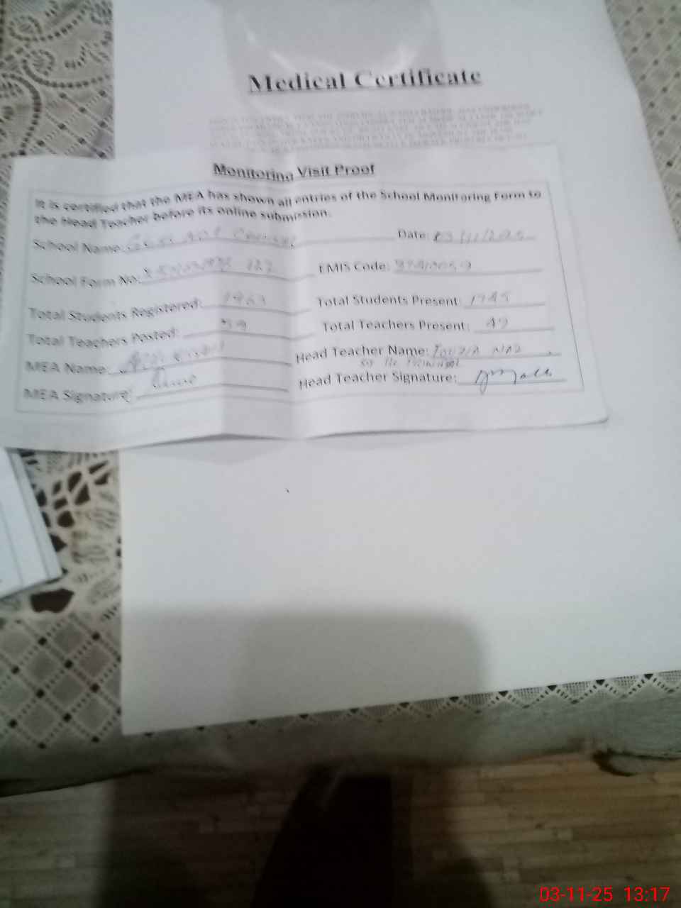 | Certified that this School was Inspected by the Undersigned MEA/DMO Today and the Information Stated Above is as Per Record. | |||||