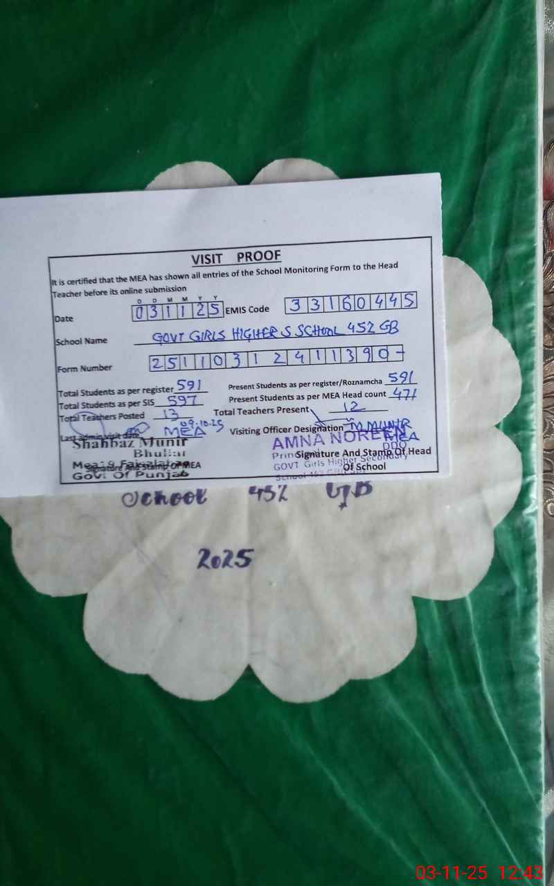 | EMIS Code: 33160445 | Name of School: GGHSS CHAK NO 452 GB | |||