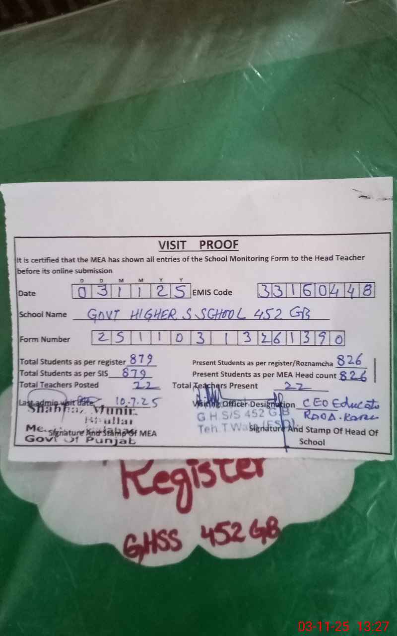 | EMIS Code: 33160448 | Name of School: GHSS CHAK NO.452 GB FSD | |||
