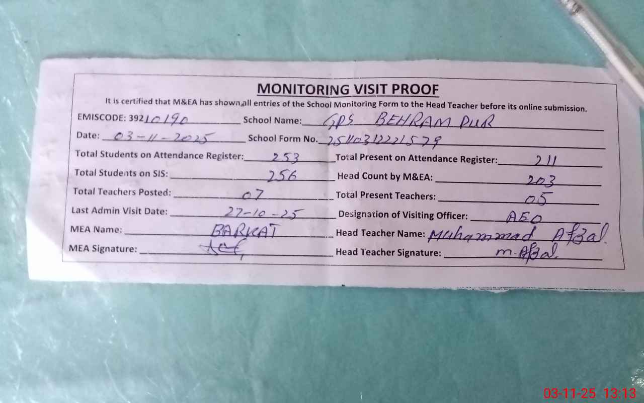 | EMIS Code: 39210190 | Name of School: GPS BEHRAM PUR PO PAKPATTAN | |||