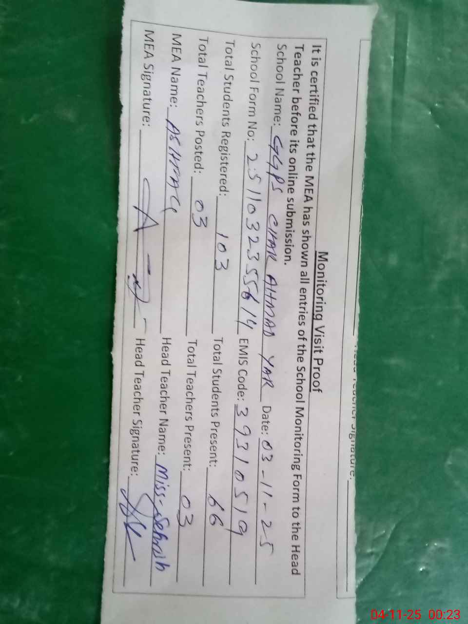 | Attendance Register | Head Teacher | MEA with School | Visit Proof |