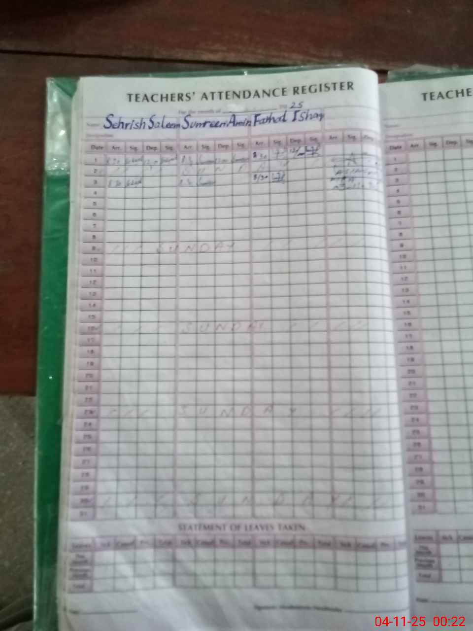 | Leave | Duty | Absent | Maternity | Medical | Ex- Pak |