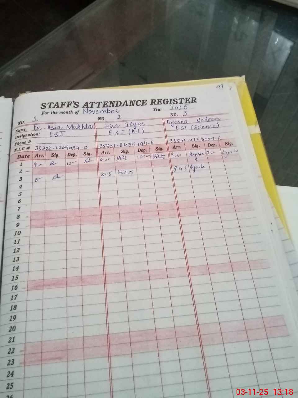 | CNIC | Full Name | Designation | R/C | Absence during last cal. month |