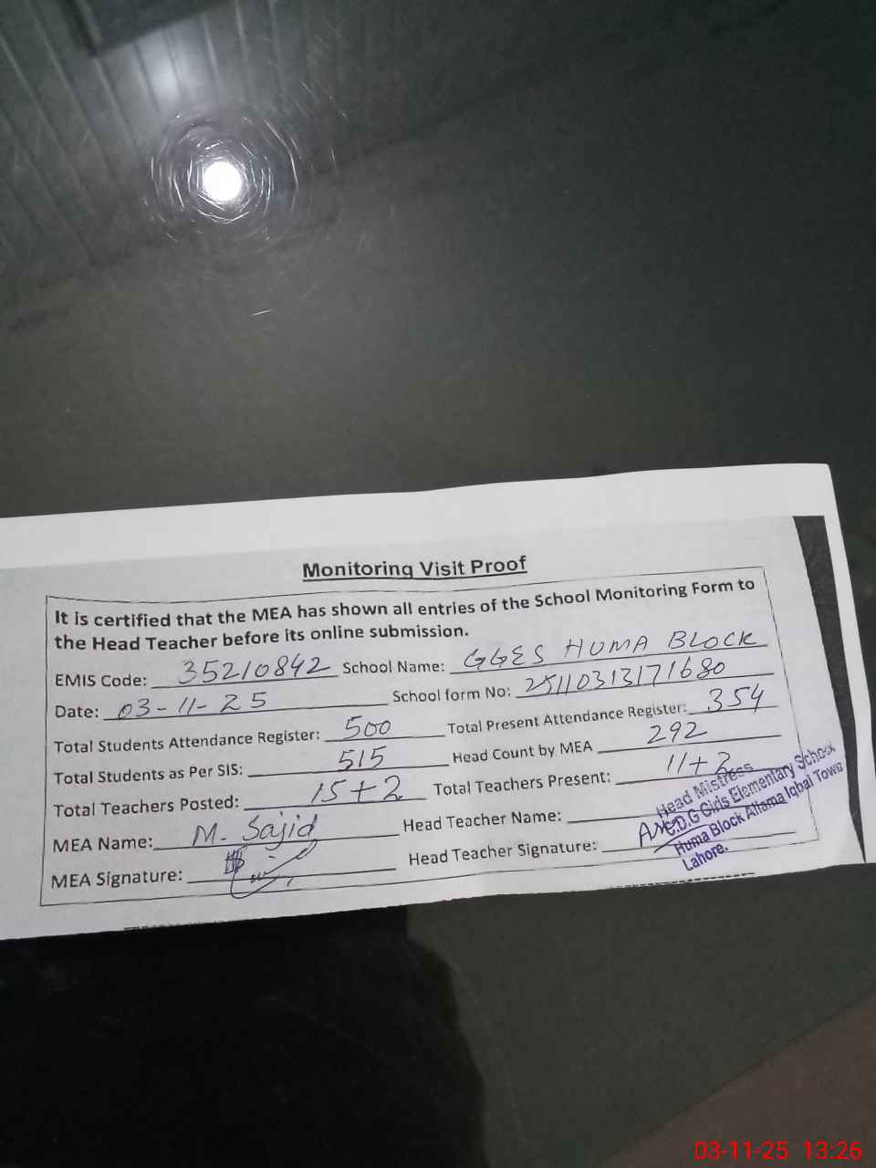 | Remarks (Use Separate Page if Required): Present students percentage is 58 percent A difference of roznamcha and head count is 62 Cleanliness is appriciable NSB and FTF bank statements are not available for Oct 2025 AEO did not visit this school in Oct 2025 35210842 | |||||