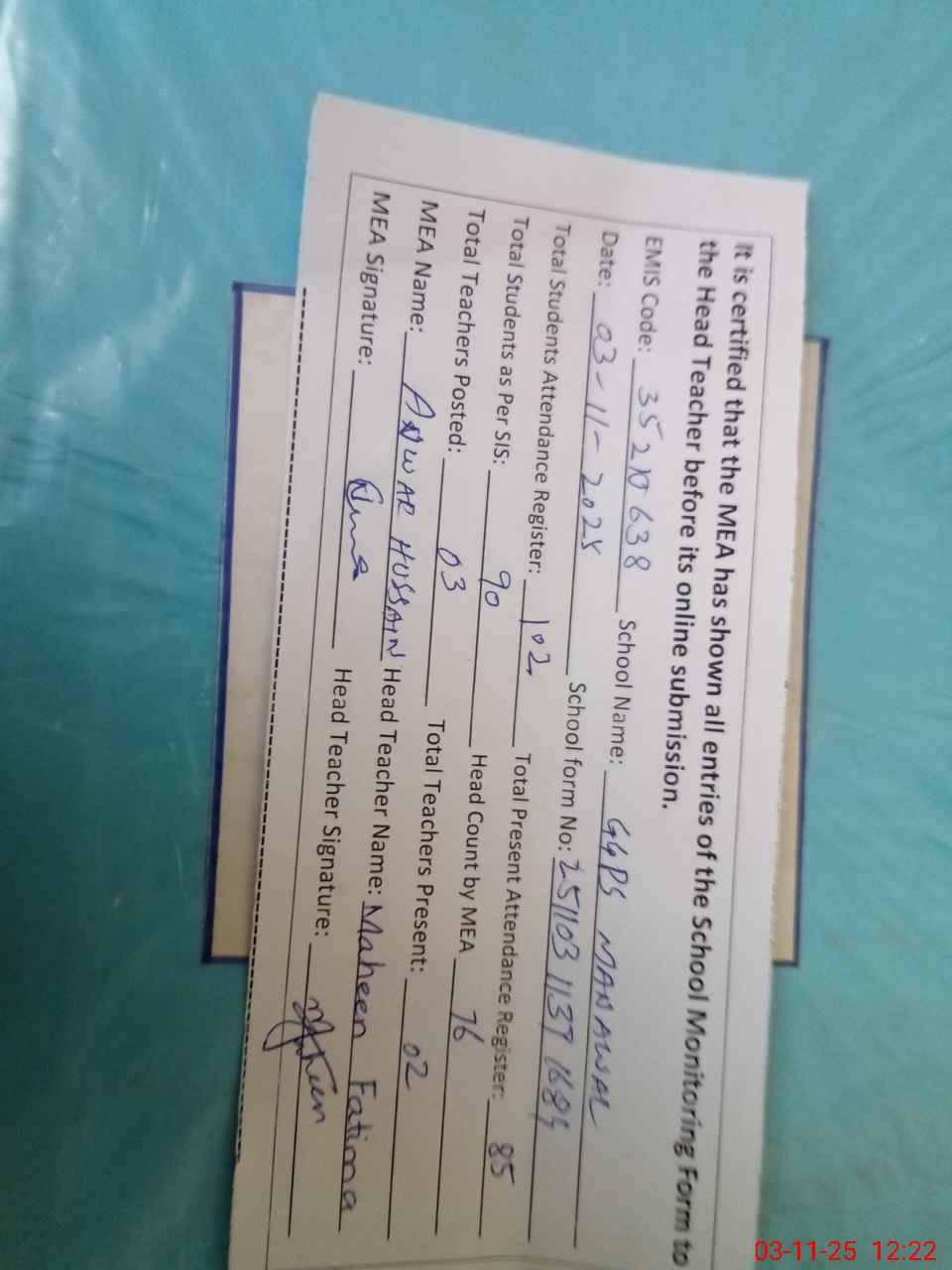 | Remarks (Use Separate Page if Required): Head Teacher mother has died she is leave NSB register not maintained 35210638 | |||||