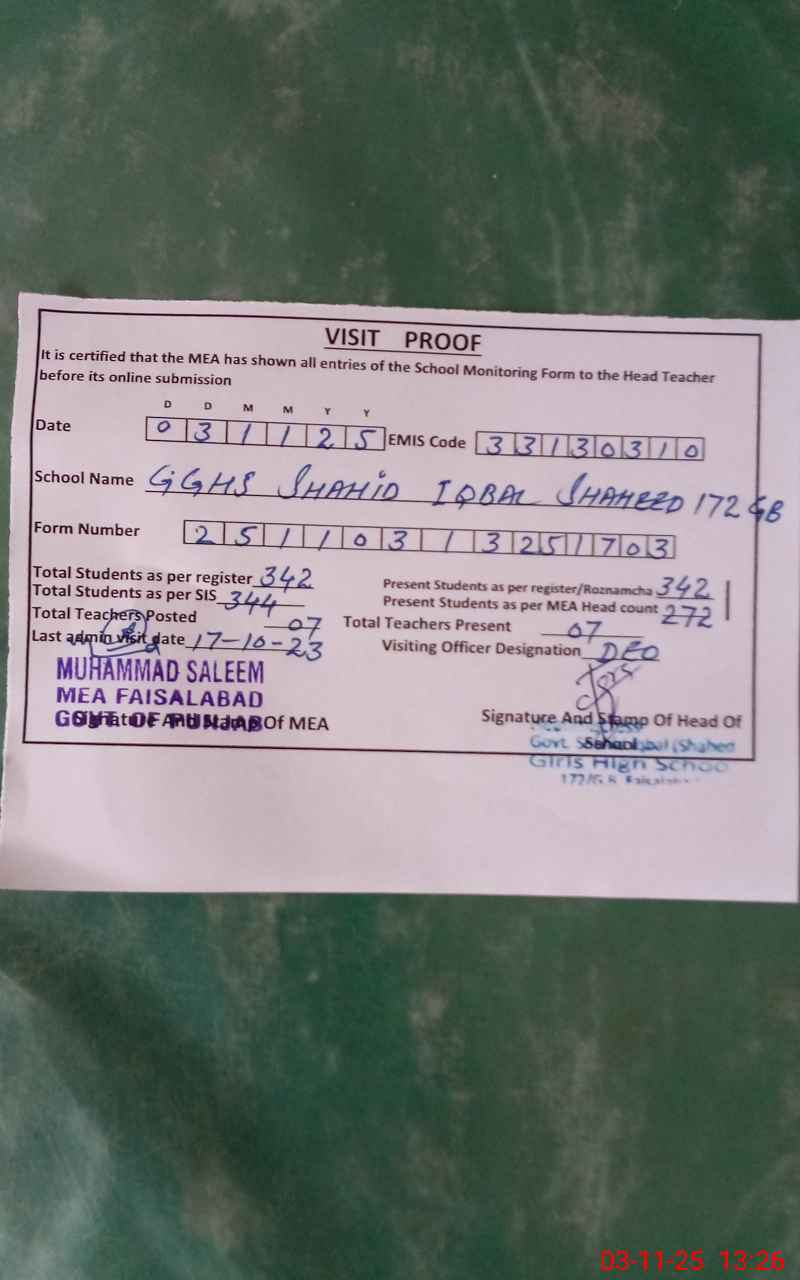 | EMIS Code: 33130310 | Name of School: GGHS SHAHID IQBAL (SHAHEED) CHAK NO 172 GB | |||