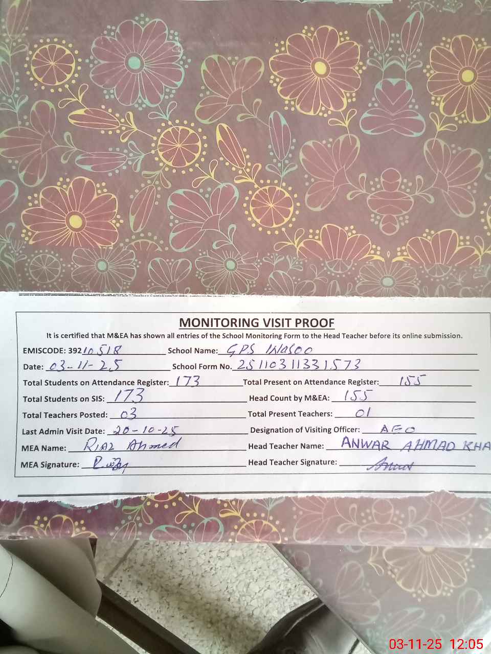 | Attendance Register | Head Teacher | MEA with School | Visit Proof |