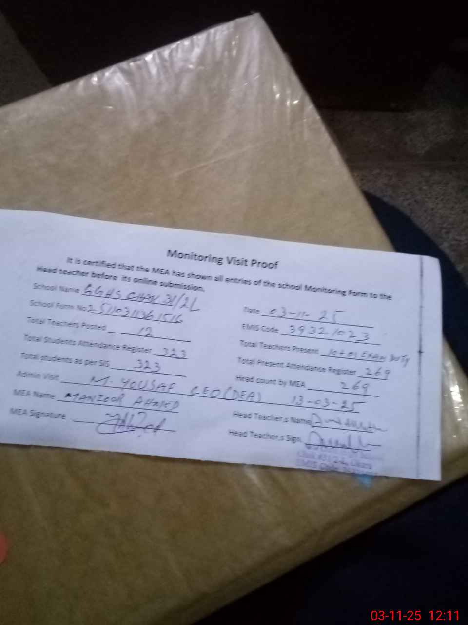 | Attendance Register | Head Teacher | MEA with School | Visit Proof |