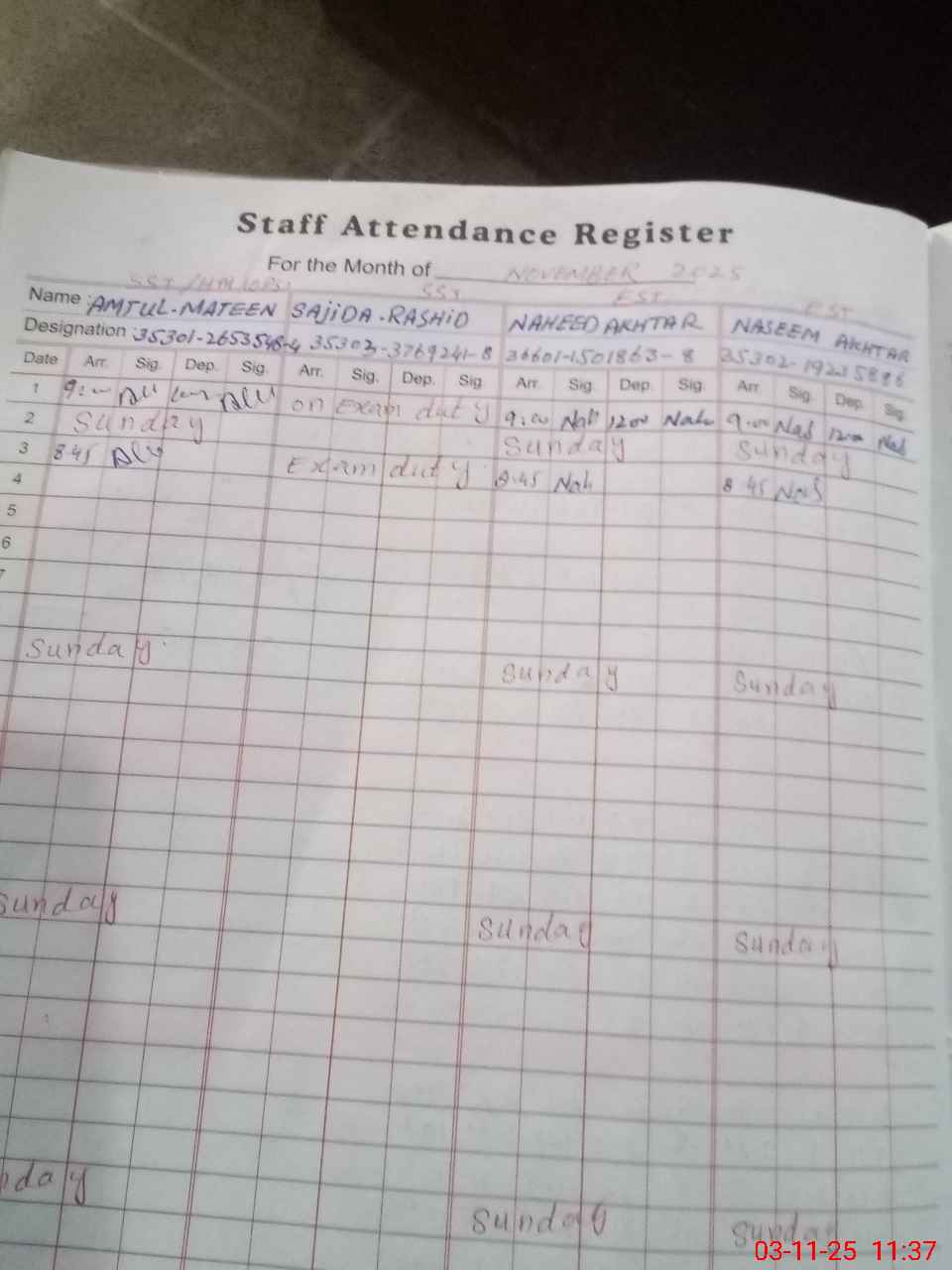 | 35**** | Sa**** Ra**** | ESE Arts | Regular | 0 | 0 | 0 | 0 | 0 | 0 | 0 | 0 | 0 | Exam Duty |
