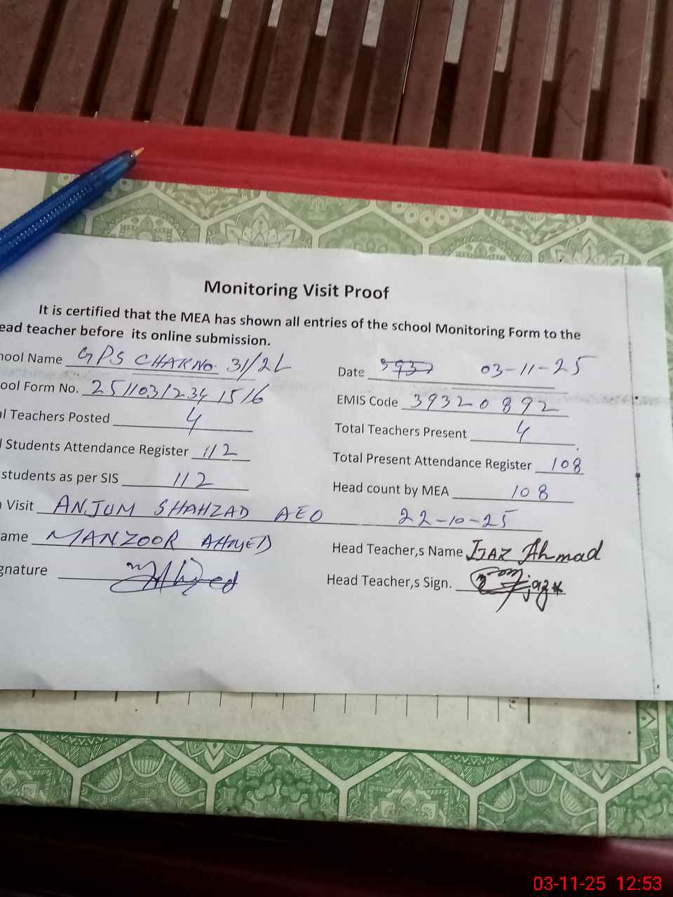| Attendance Register | Head Teacher | MEA with School | Visit Proof |