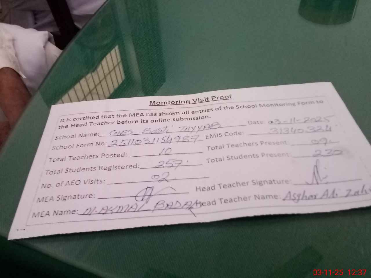 | Monitoring Date: 03-11-2025 | Start Time: 03-11-2025 11:53 AM | End Time: 03-11-2025 12:38 PM | Name of MEA: Mu**** Ak**** Ba**** | |