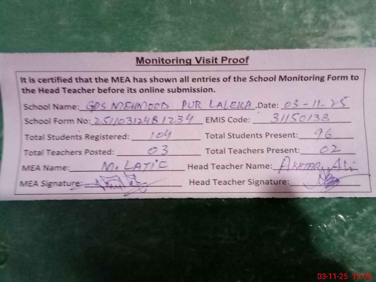 | Attendance Register | Head Teacher | MEA with School | Visit Proof |