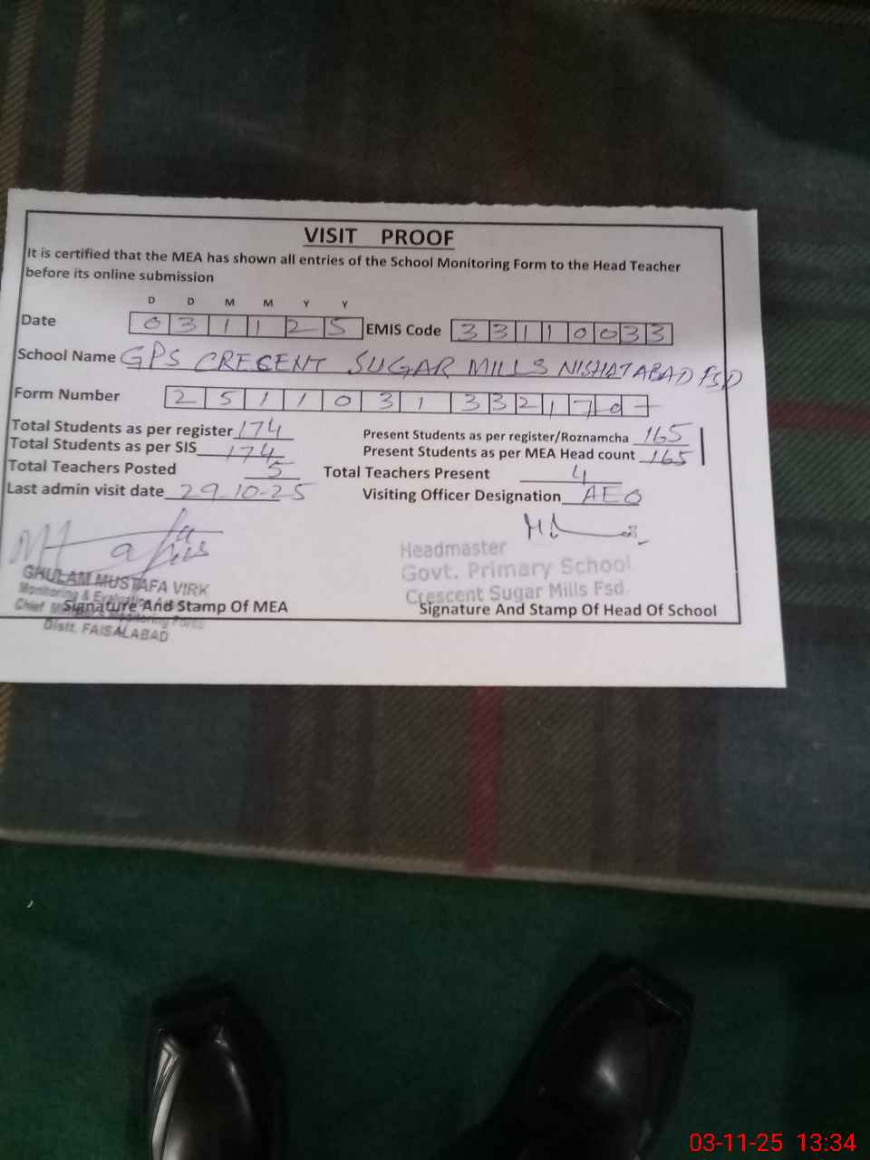 | Attendance Register | Head Teacher | MEA with School | Visit Proof |