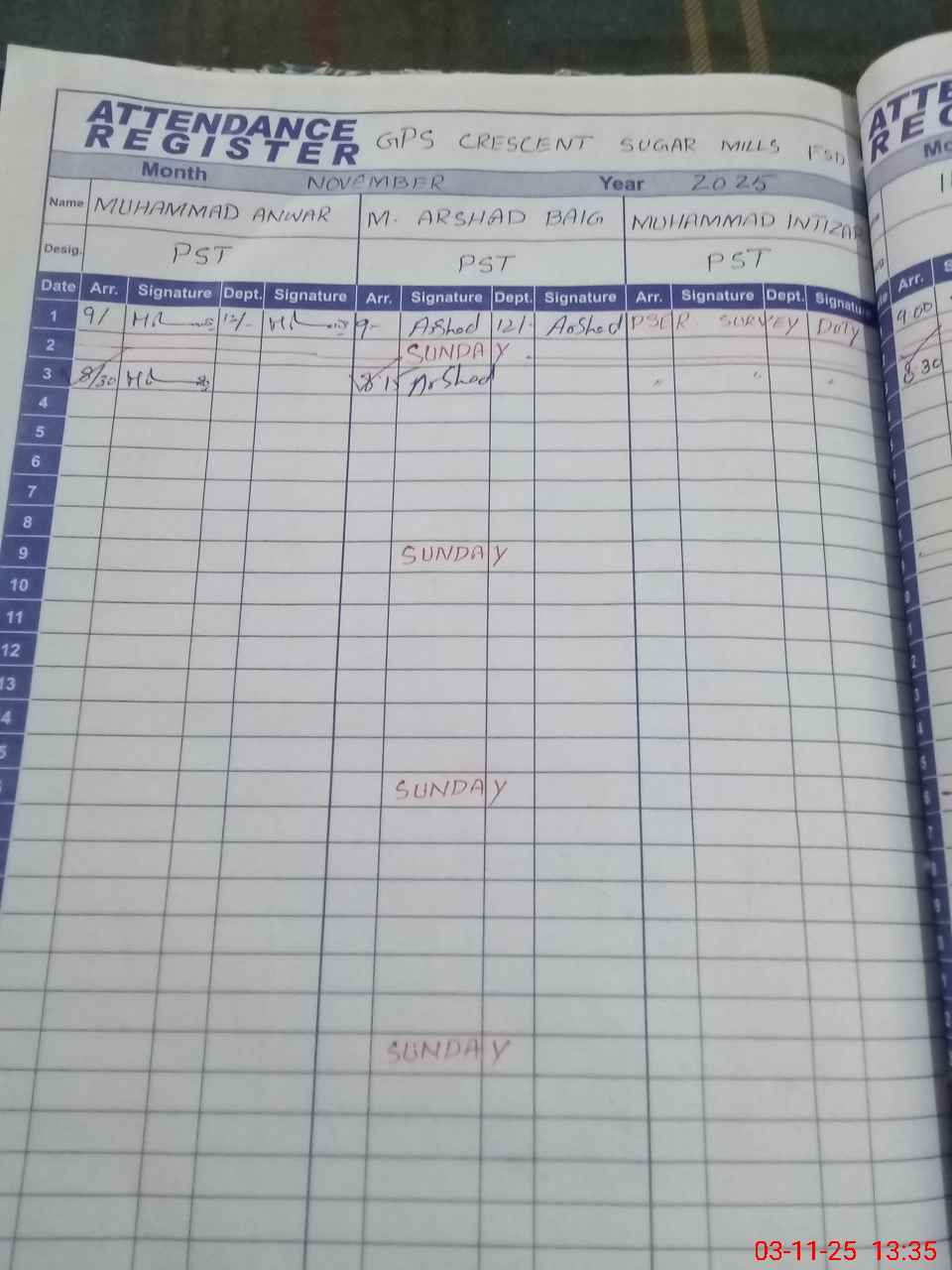 | CNIC | Full Name | Designation | R/C | Absence During Last Calender Month |