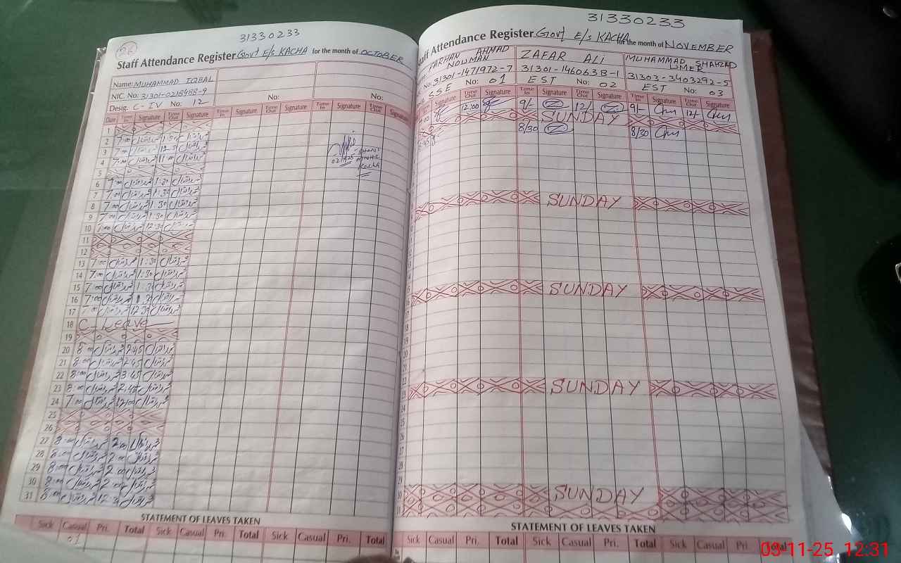 | CNIC | Full Name | Designation | R/C | Absence During Last Calender Month |
