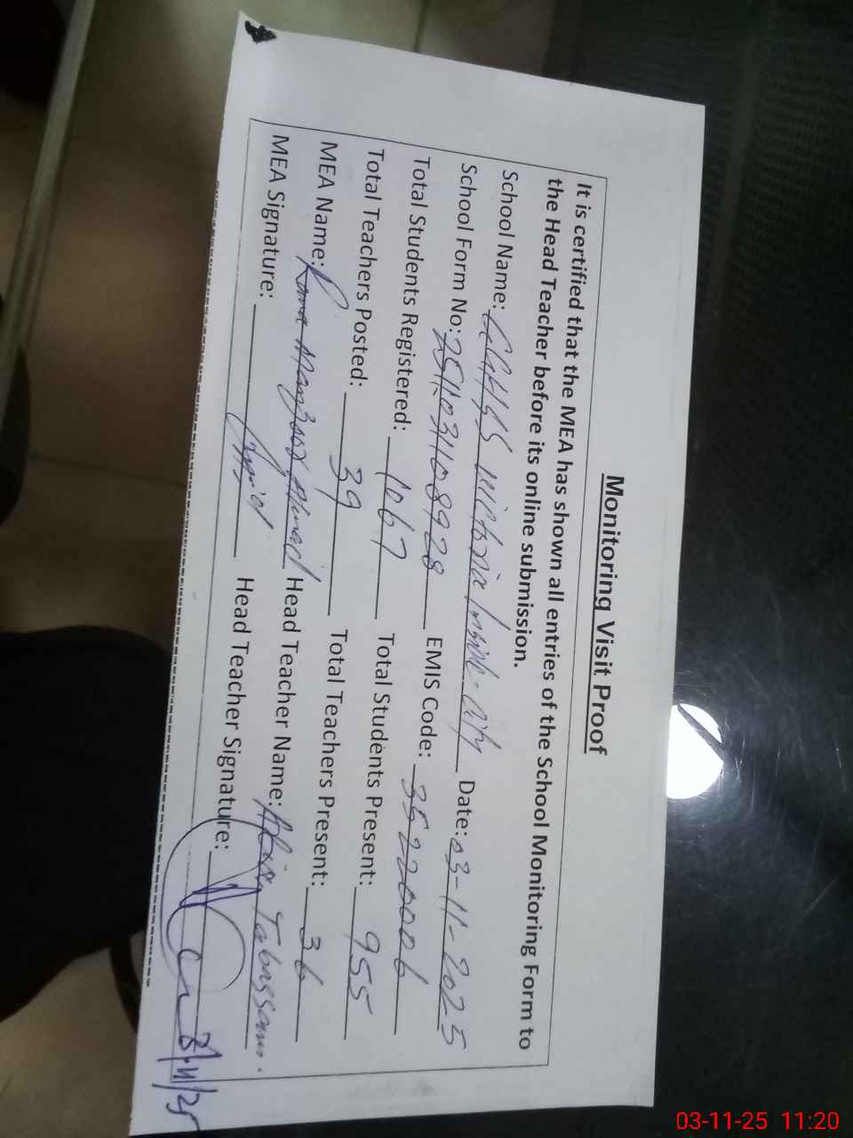 | Attendance Register | Head Teacher | MEA with School | Visit Proof |