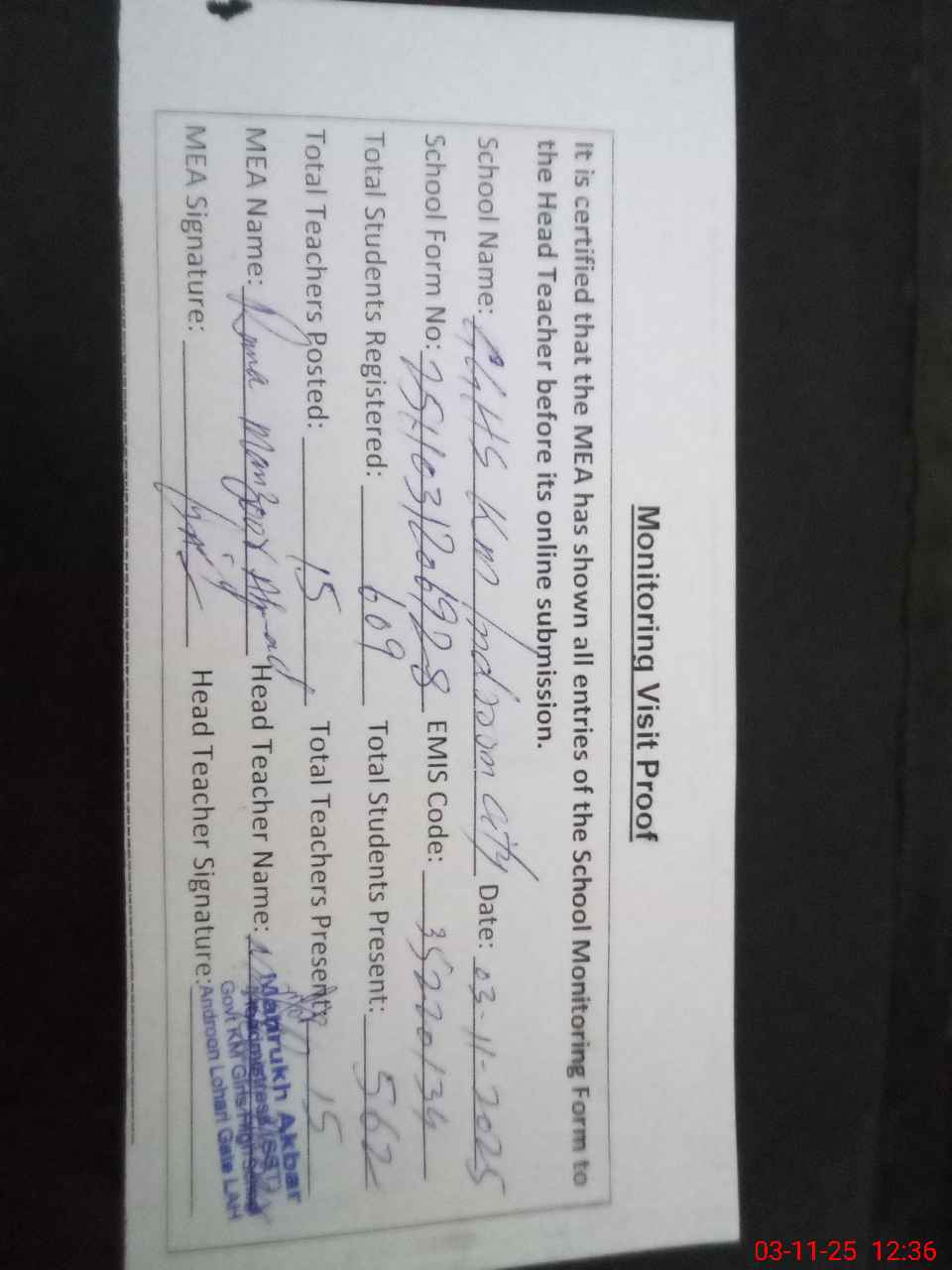 | Attendance Register | Head Teacher | MEA with School | Visit Proof |