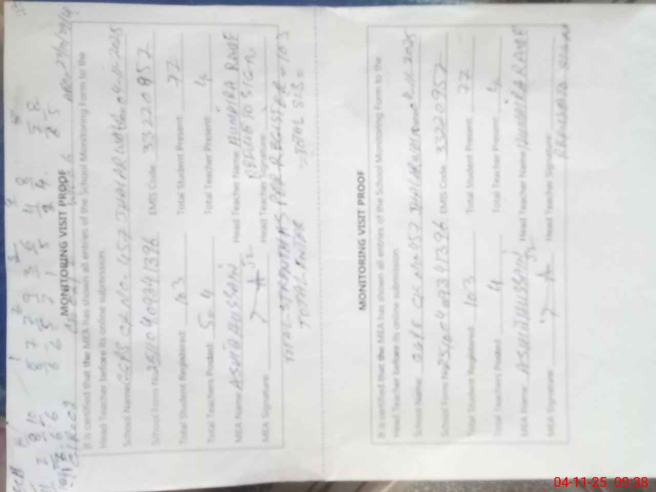 | Attendance Register | Head Teacher | MEA with School | Visit Proof |