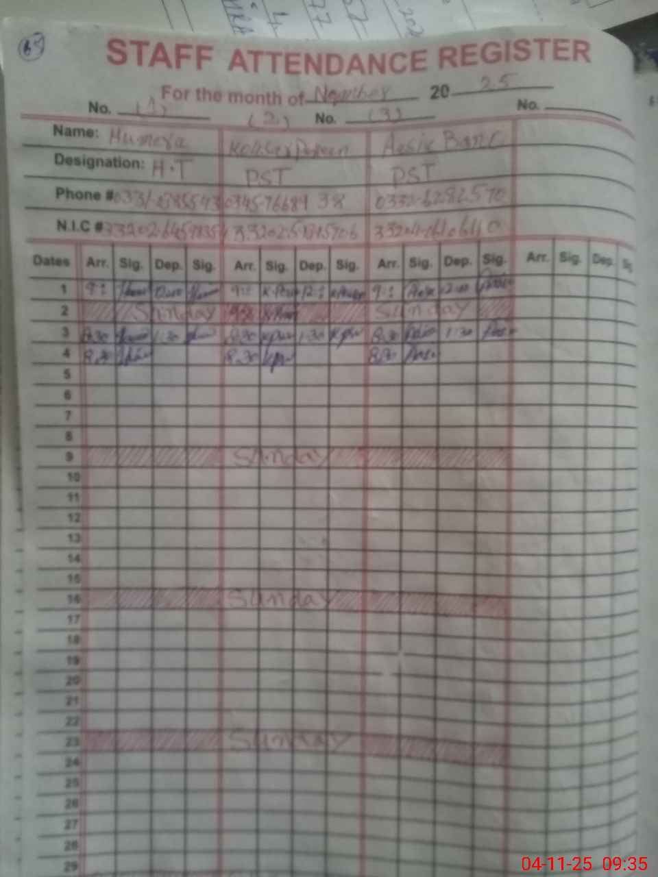 | CNIC | Full Name | Designation | R/C | Absence During Last Calender Month |