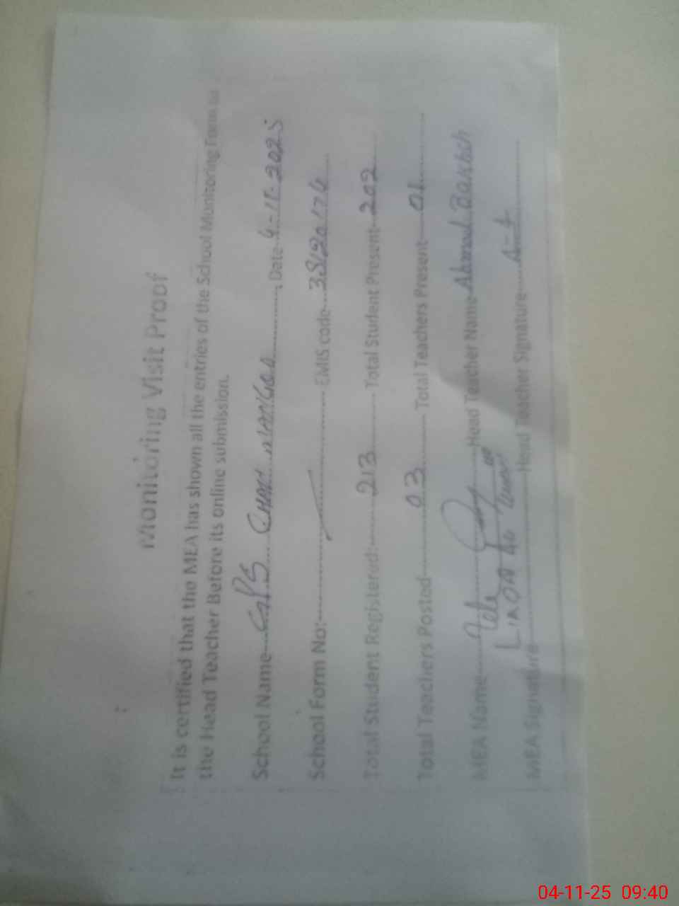 | Attendance Register | Head Teacher | MEA with School | Visit Proof |