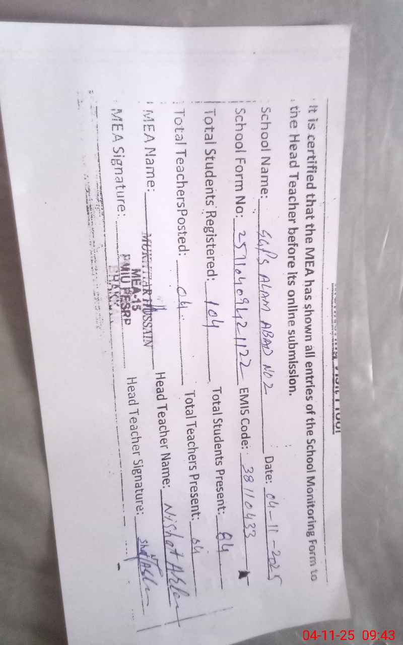 | EMIS Code: 38110433 | Name of School: GGPS ALAM ABAD NO.2 | |||