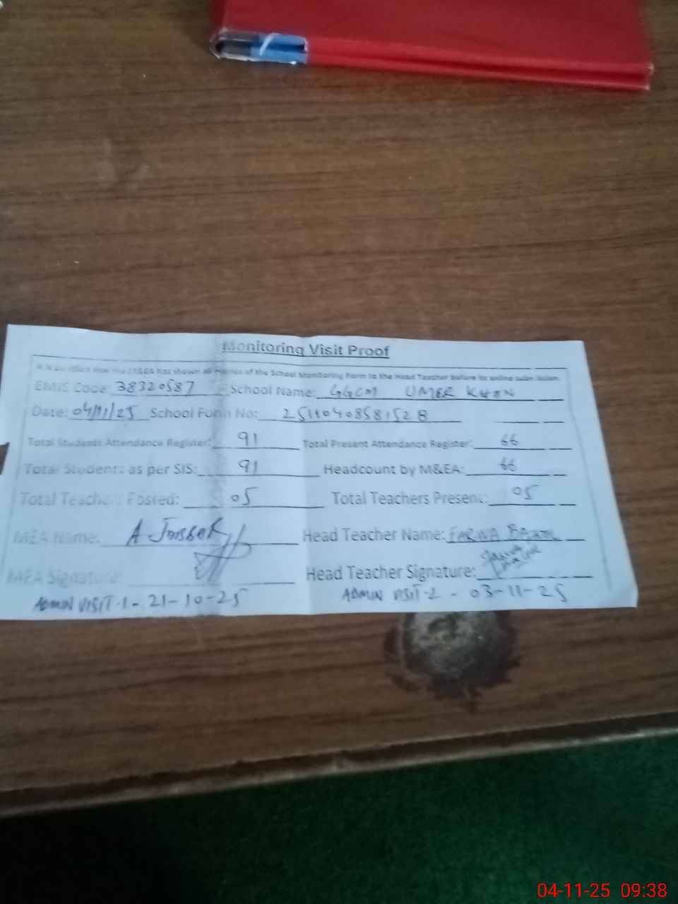| Attendance Register | Head Teacher | MEA with School | Visit Proof |