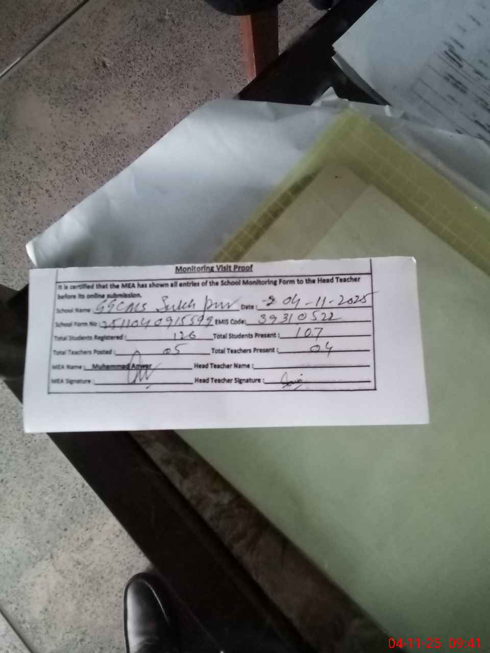 | Attendance Register | Head Teacher | MEA with School | Visit Proof |