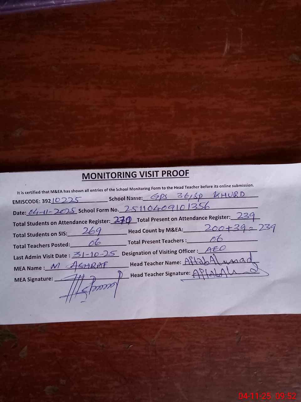 | EMIS Code: 39210225 | Name of School: GPS CHAK NO. 36/SP KHURD | |||