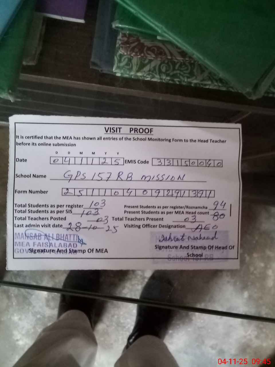 | Attendance Register | Head Teacher | MEA with School | Visit Proof |
