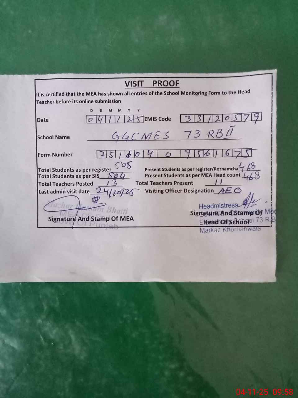 | Attendance Register | Head Teacher | MEA with School | Visit Proof |