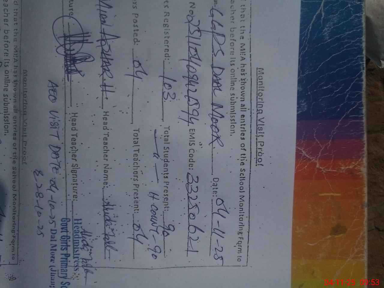| Attendance Register | Head Teacher | MEA with School | Visit Proof |