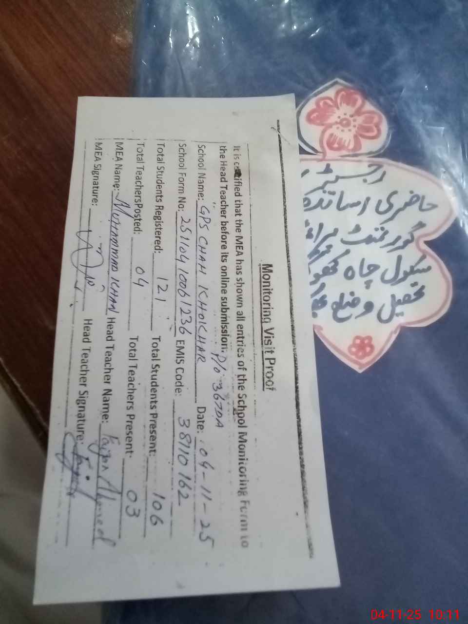 | EMIS Code: 38110162 | Name of School: GPS CHAH KHOKAR P.O 36 TDA | |||