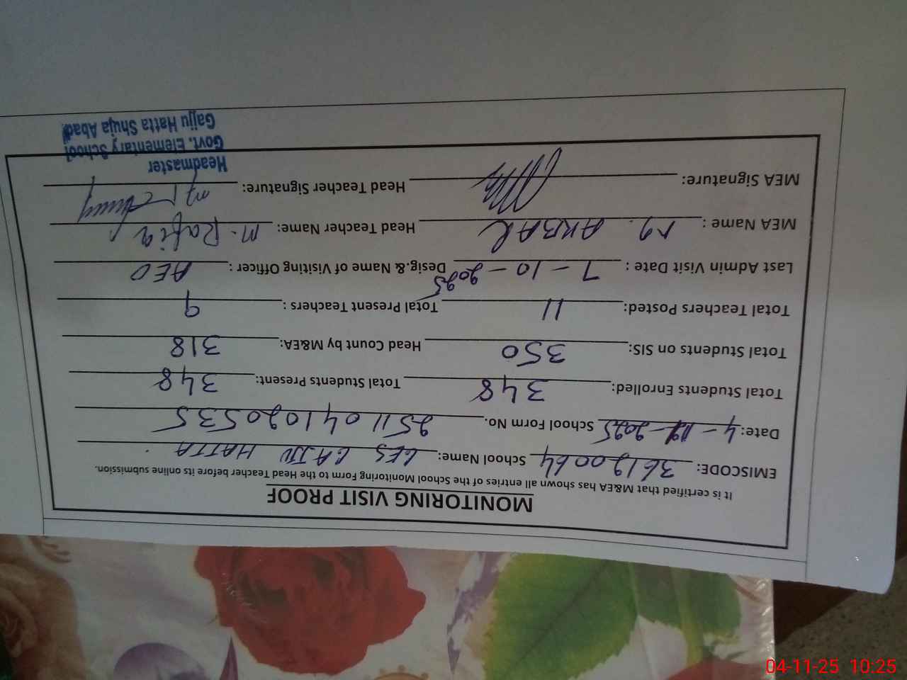 | Certified that this School was Inspected by the Undersigned MEA/DMO Today and the Information Stated Above is as Per Record. | |||||