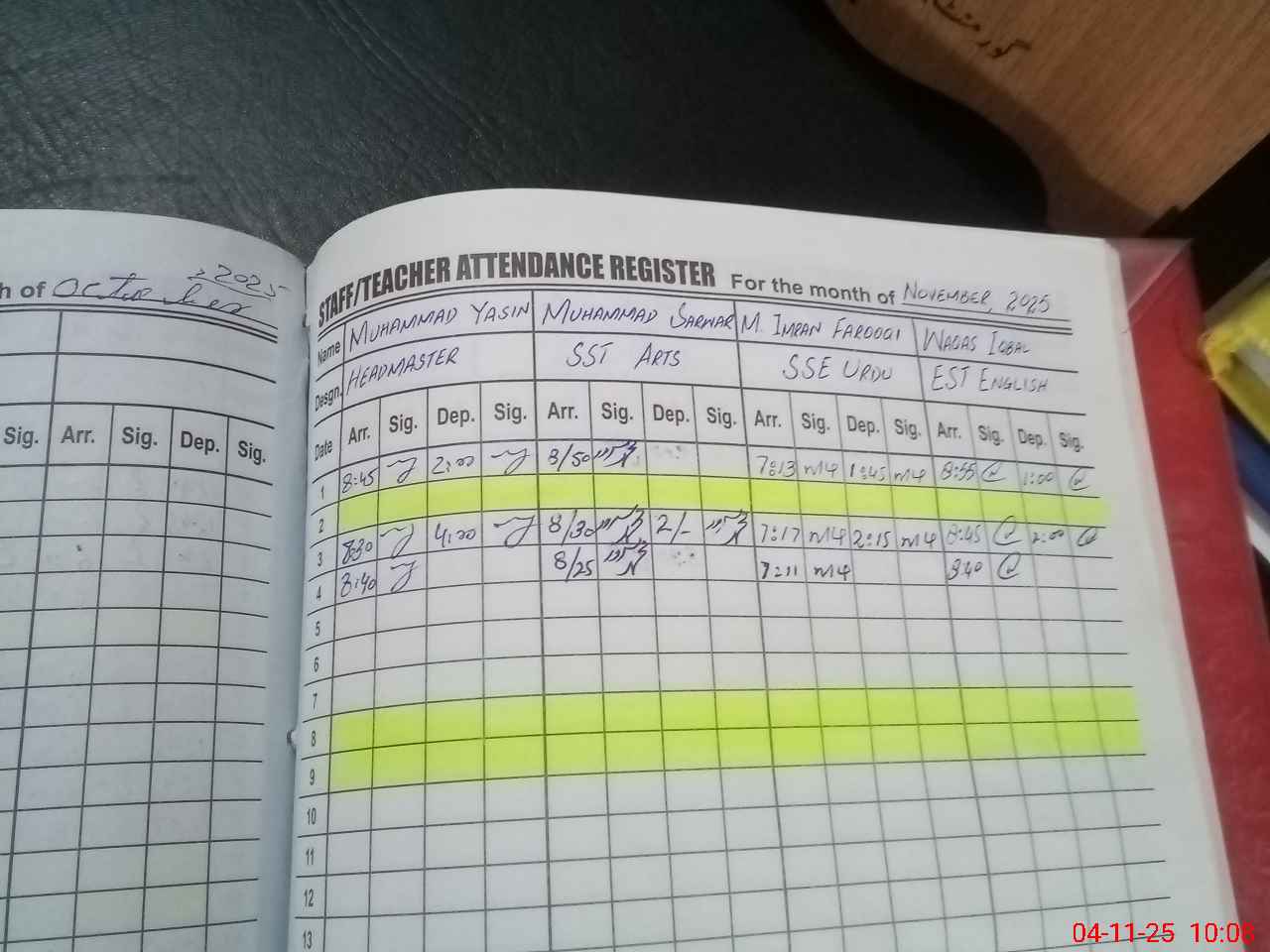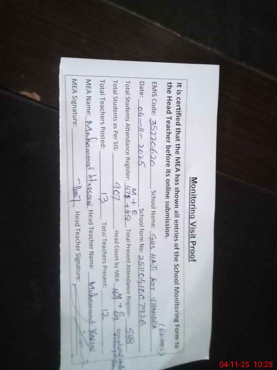 | Remarks (Use Separate Page if Required): 1 Class eight and prep class students name not written on the students attendence register for the month of November 2025 2 Students toilets cleaning condition is very poor 3 One small room used as a store 4 Student attendence morning 35 percent and school double shift and students presents showing 92 percent double shift students present data entered from previous day from roznamcha 5 Students difference 73 students from head count and roznamcha of morning shift | |||||