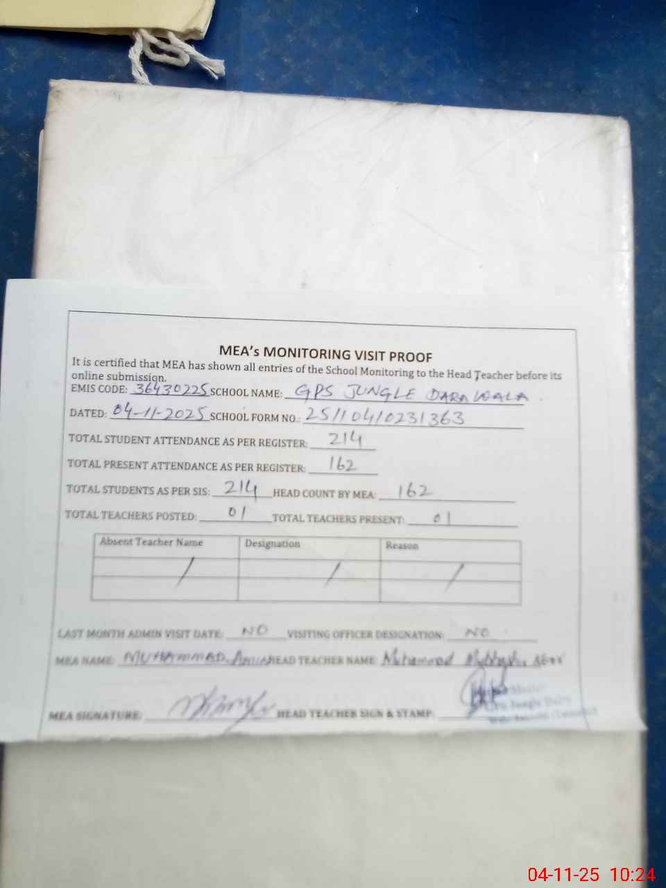 | EMIS Code: 36430225 | Name of School: GPS JUNGLE DARA WALA, TULAMBA | |||