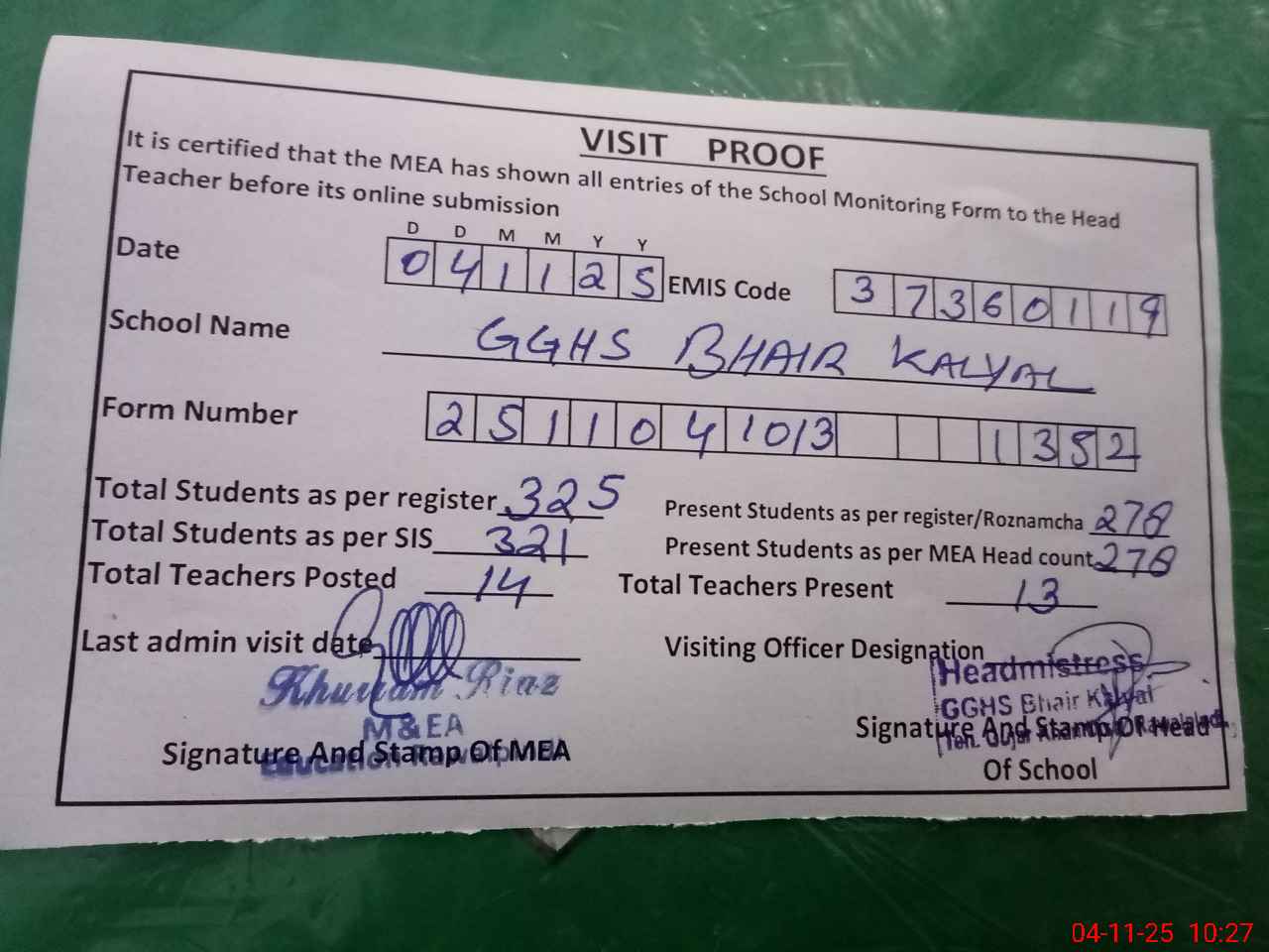 | Attendance Register | Head Teacher | MEA with School | Visit Proof |