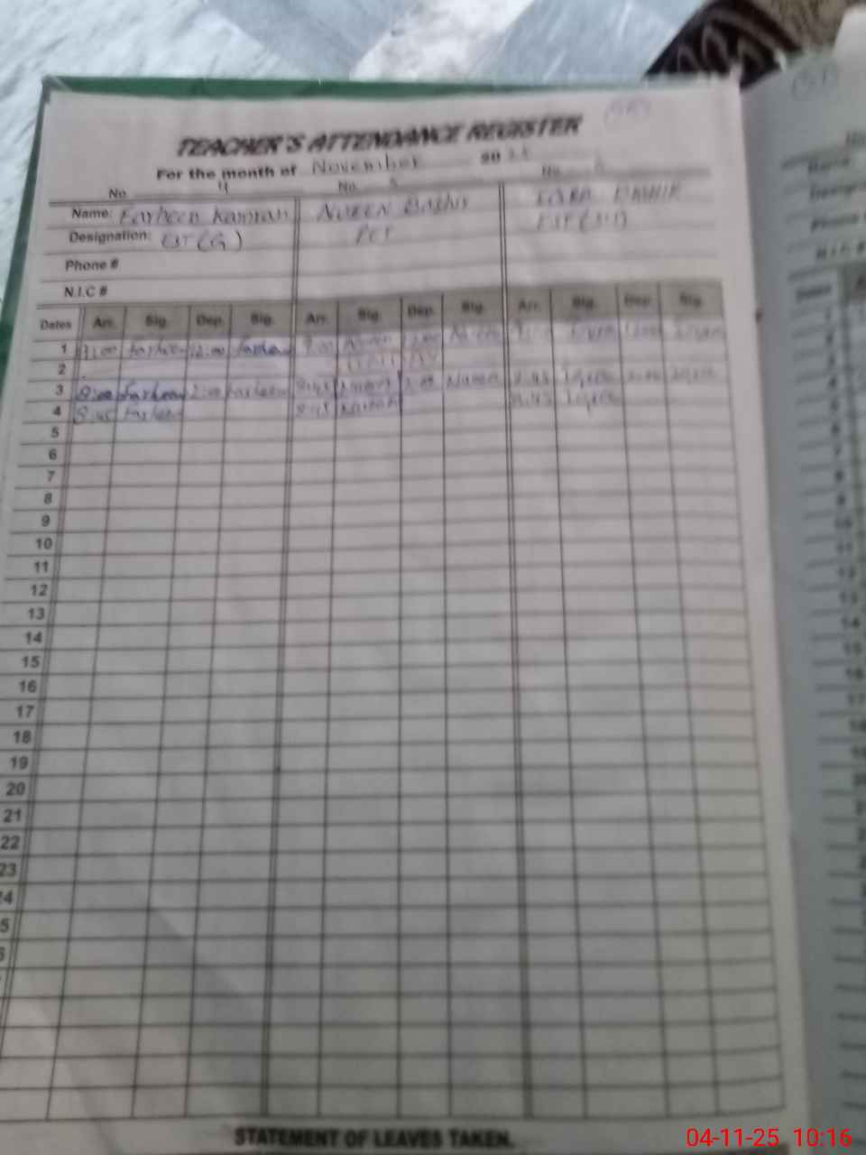 | CNIC | Full Name | Designation | R/C | Absence During Last Calender Month |